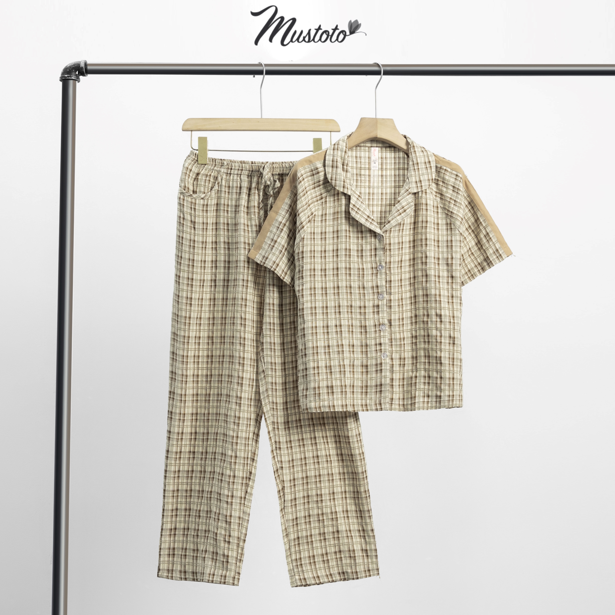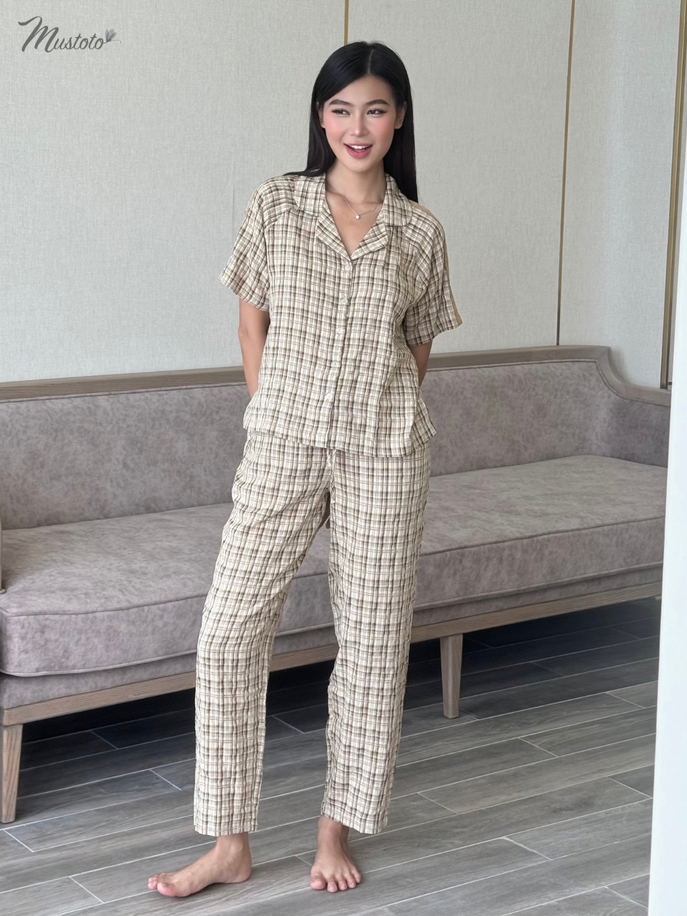 - Bộ đồ ngủ vải cotton hoạ tiết kẻ viền nâu nhạt giúp Nàng luôn thoải mái và quyến rũ.